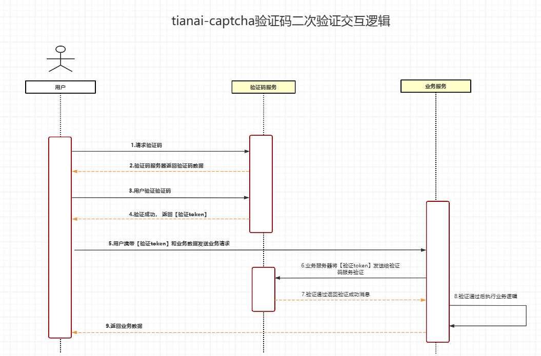 token,前端调用自身业务接口的时候顺带给后台传上该token,然后后台再校验该token的有效性;这样就可以完成验证码和自身自身业务接口的绑定了;事实上目前大部分行为验证码提供商都是这样子的一种流程。方便用户进一步了解二次验证附上交互流程图。
