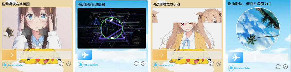 开源版默认提供了 滑块验证码、旋转验证码、文字点选验证码、滑动还原验证码等,